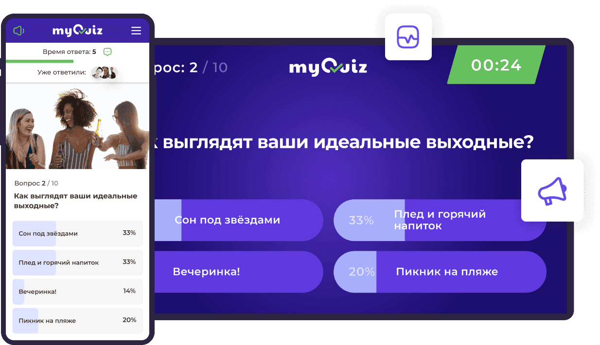 Прекрасный сервис для проведения викторин — myQuiz — не раз выручал нас и наших клиентов на офлайн-мероприятиях, онлайн трансляциях и презентациях. Удобная консоль управления, персонализация интерфейса и другие удобные функции, например: доступ к викторине по email или event-режим, позволяют максимально завлечь аудиторию к изучению какого-либо продукта через игровую механику. «Легкая настройка и широкий функционал», — так мы говорим клиентам, когда рассказываем про активности с myQuiz.