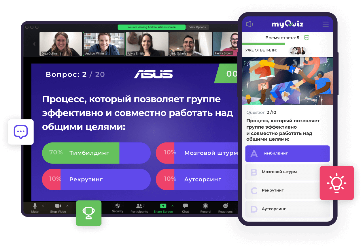 - Опросы в режиме реального времени помогают проводить увлекательные мозговые штурмы и дают возможность всем участникам высказать свое мнение