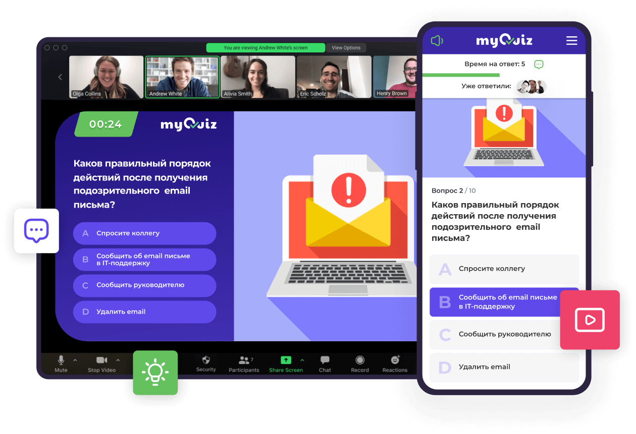 - Проверяйте знания в различных игровых режимах, чтобы оживить ваши вебинары
